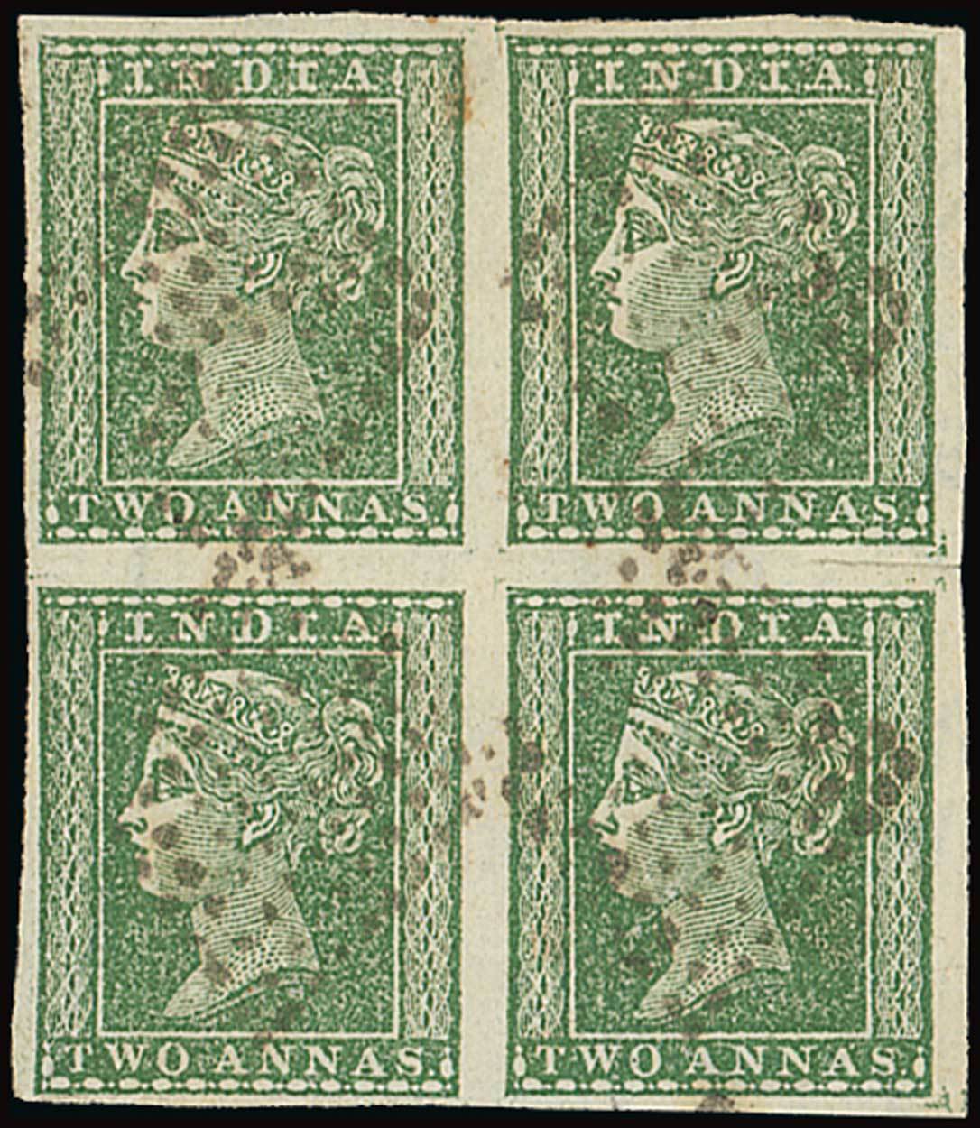 A block of four with clear to large margins and each neatly cancelled by diamond of dots; scissor-cut between at right; fine. Photo