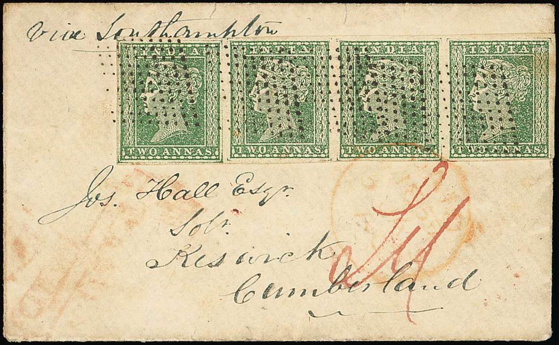 Green horizontal strip of four, each neatly cancelled by diamond of dots and tied on small on 1855 (Jan.) envelope from Calcutta "via Southampton" to Keswick, light Paid datestamp additionally ties the strip. Photo