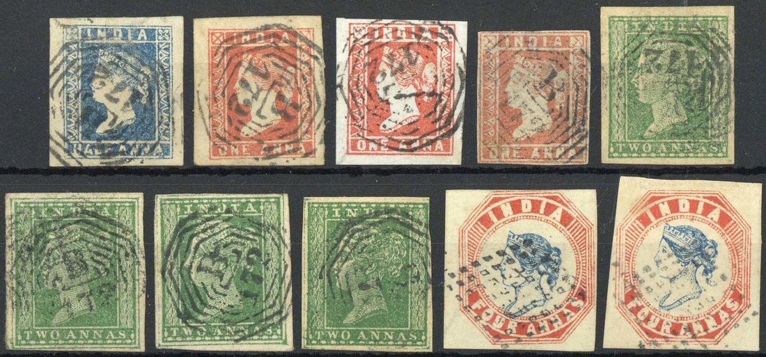 A small group of 1854 issues (10) including ½a. Die I, 1a. Dies I and II, and 2a. (4, two showing outer framelines), all but one 2a. with four margins and all cancelled "B/172", and 4a. (2) cancelled by diamond of hollow dots, generally fine