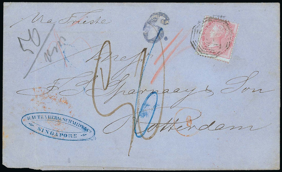 1860 (July) entire from Singapore to Rotterdam, marked "Via Trieste", rated "6" in blue, "1/-" in red and "90", bearing 1855 8a. carmine on blued paper tied by unclear obliterator, showing sender's blue cachet at left, handstruck "6." in blue and, on reverse across join, fine "singapore/p.o." double-ring d.s. and arrival c.d.s. (25.8), both in red. A scarce destination for this period. Photo