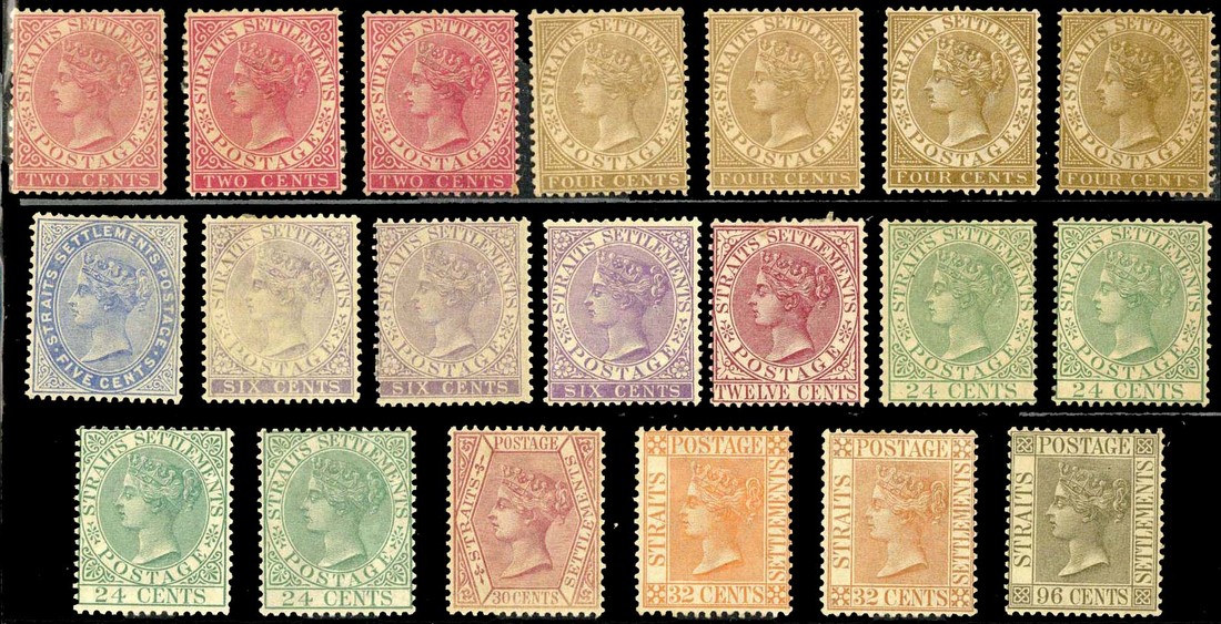 A mint and used collection including India 1854 ½a., 1a. (cut-into), 2a. pair and single (cut-into) and 4a. cancelled "B/172", 1867 on India 1½c. on ½a. (2, one unused), 2c. on 1a. (2), 3c. on 1a., 4c. on 1a. (3, two unused), 6c. on 2a. (2), 8c. on 2a. (2), 12c. on 4a. (2), 24c. on 8a. (3) and 32c. on 2a. (2) all used, 1879 (May) 5c. on 8c. and 7c. on 32c., 1883-91 CA 2c. to 96c, with some shades plus 32c. with watermark inverted, 1892-99 1c. to $5 overprinted "specimen" and mint ($5 a pair), 1902 CA 1c. to $5 overprinted "specimen" and mint, 1904-10 MCA 3c. to $5, 1906-07 1c. to $1 mint and used, 1909-12 1c. to $5 with additional $1 to $5, 1912-23 MCA 1c. to $5 , 1921-33 Script 1c. to $5 (6), 1922 Exhibition set and 1936 1c. to $5 mint and used, also a range of BMA values and unissued Malayan Union 1946 Victory 8c.; condition very mixed with toning/light staining prevalent throughout. Cat. £12,000 approx