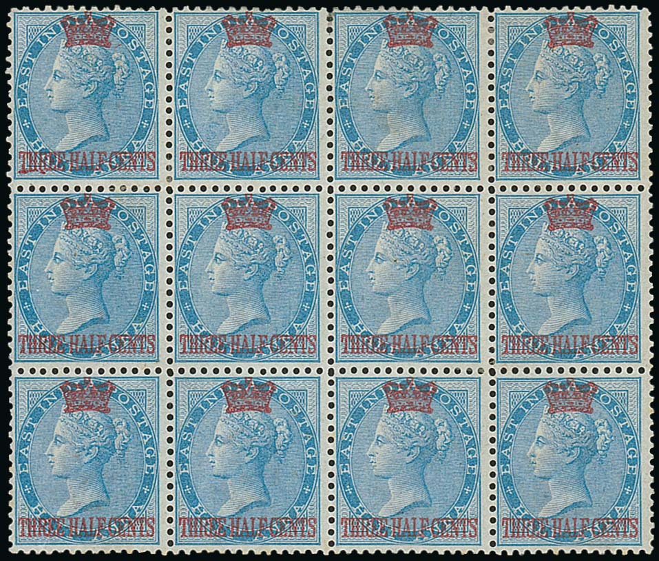 1½c. on ½a. blue, a block of twelve (4x3) unused with large part original gum, fine. S.G. 1. Photo