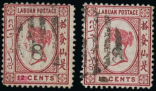 1880 "8" on 12c. carmine (2) with original value obliterated by manuscript bar in red and in black, both cancelled by oval of bars, fine. S.G. 11, £1700. Photo