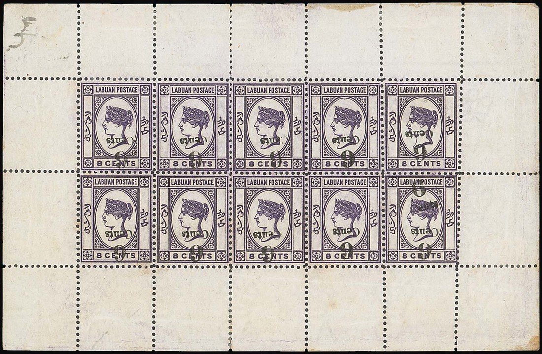 1891-92 6c. in black on 8c. deep violet, 2mm. setting, a complete mint sheet (5x2) with nine showing surcharge inverted and [10] showing surcharge double, one inverted, fine. Rare. R.P.S. Certificate (1966). S.G. 34a, 34c, £3700+. Photo