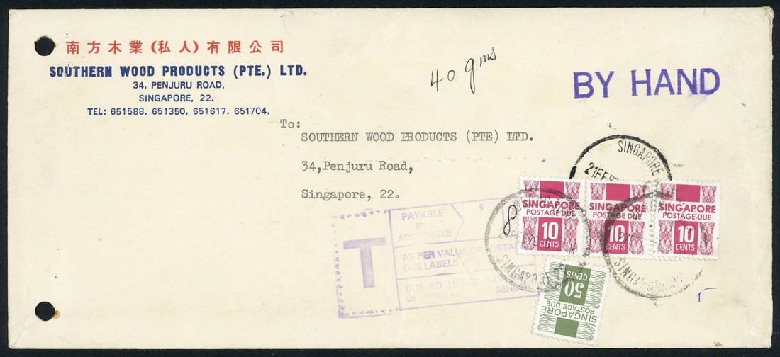 1979 (21 Feb.) locally addressed unstamped firm's envelope (230x103mm.), marked "40 gms", showing despatch c.d.s. and large framed Tax h.s. in violet, both partly obscured by Postage Due 10c. (3) and 50c. clearly tied by c.d.s. dated 27 February; the envelope with two punch holes at left