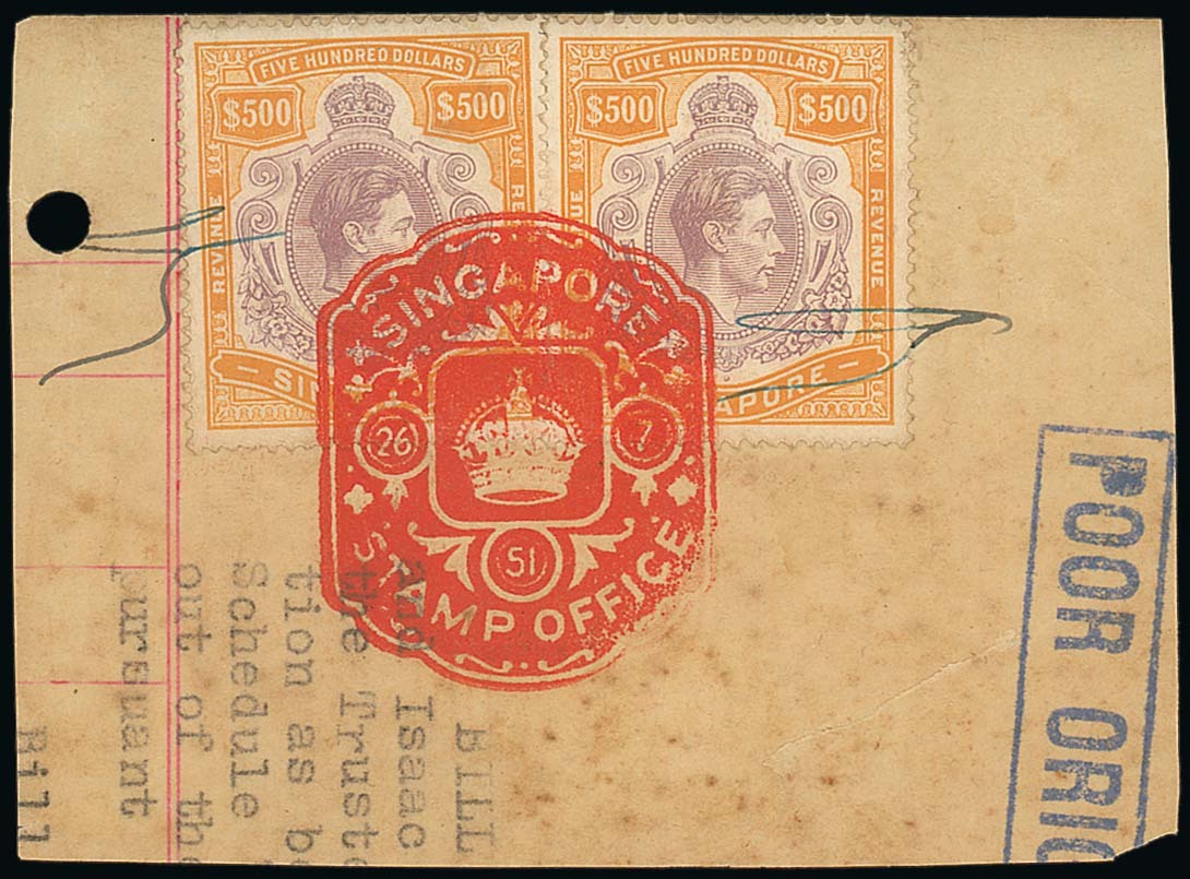 1948 $500 purple and yellow, two examples on piece tied by ink squiggle and clear red embossed datestamp (26.7.51), fine. Scarce. Barefoot 3. Photo