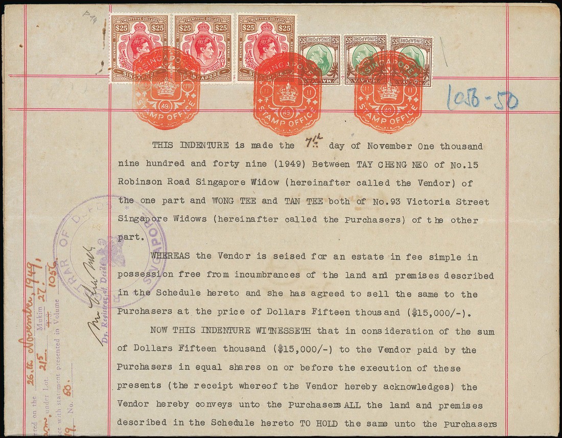 1949 (11 Nov.) Complete indenture bearing 1948 $25 red and brown (3) with Postage 1948 $5 (3), all clearly tied by red embossed datestamp and showing large "registrar of deeds/singapore" circular cachet, fine. Photo