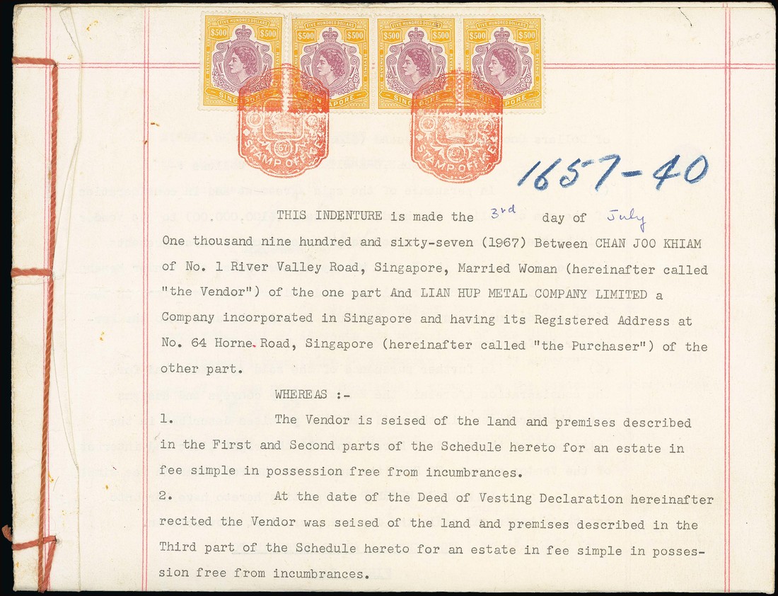 1967 (3 July) Indenture bearing 1954 $500 strip of three (the first stamp showing three breaks in leaves at lower right and a single (small puncture towards upper right), all tied by red embossed datestamp (17.7). A clean and fine document. Photo