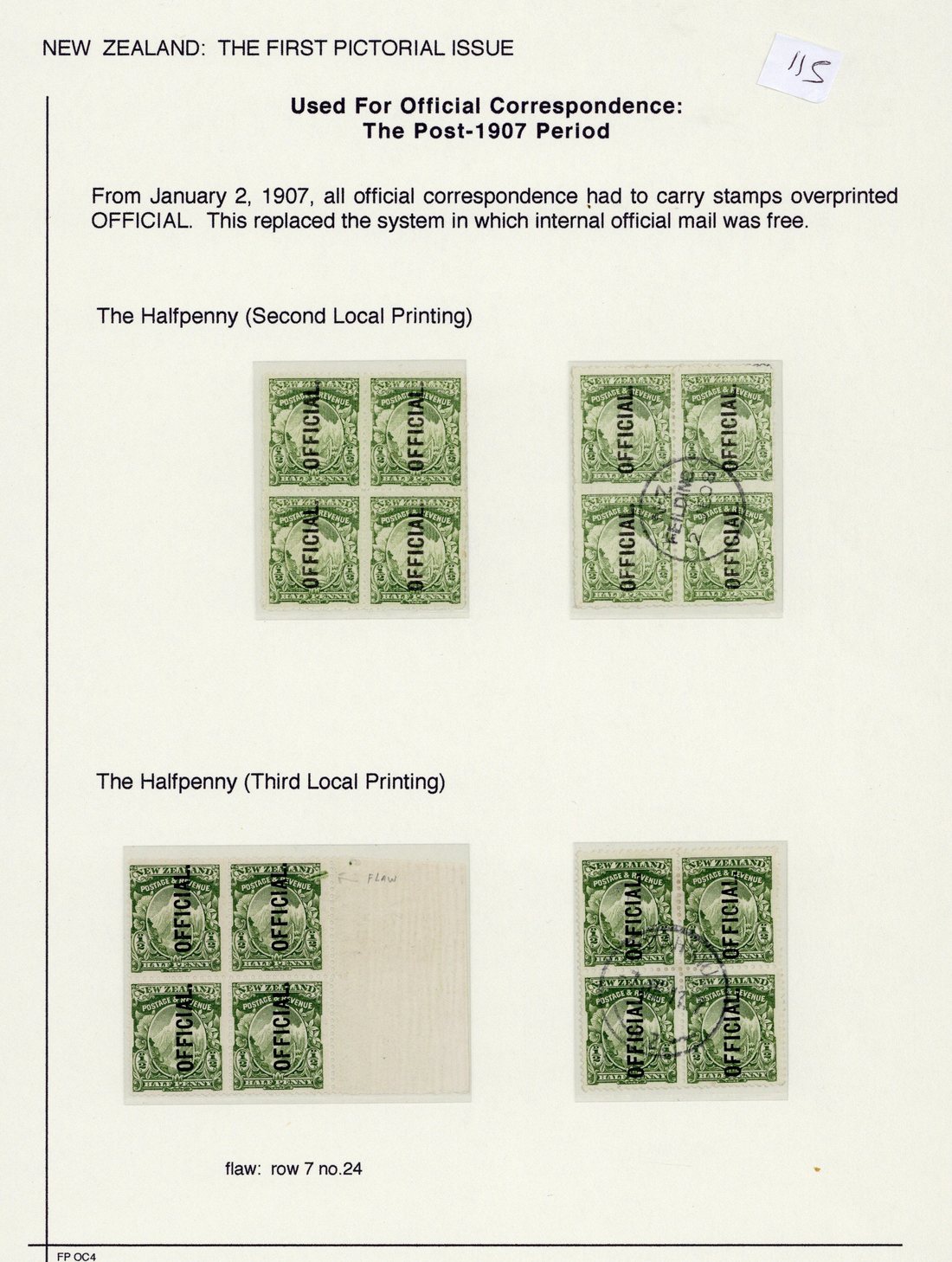 ½d. block of four, unmounted mint (one with small stain), block of four with central Fielding c.d.s.; Perf. 14x15 mint block of four with [R.7/24] flaw, block of four with central Otahuhu c.d.s.; fine. S.G. O59, O69, FO4b, 5c