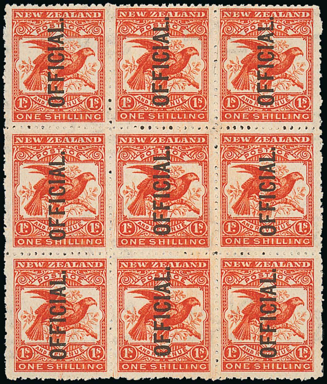 1/- orange-red Kea and Kaka block of nine (3x3), fine unmounted mint and scarce. S.G. O65, £990, EO18e, $8,775. Photo