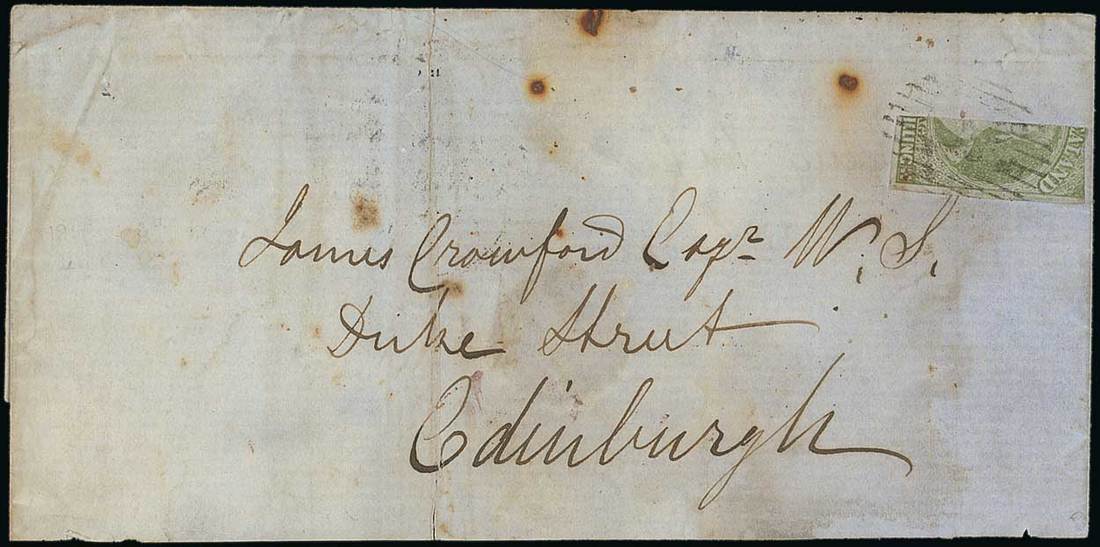 1855-58 blued paper, 1/- green bisected vertically and tied by "18" obliterator on 1858 (23 Dec.) entire (bottom flap missing) from Otago to Edinburgh showing, on reverse, despatch and arrival (1.4) datestamps; the bisect crossed by light vertical filing creases and the face panel a little soiled and with three small burn marks. R.P.S. of N.Z. Certificate (1996). C.P. A6b(Y), $50,000; S.G. 6a, £26,000. Photo