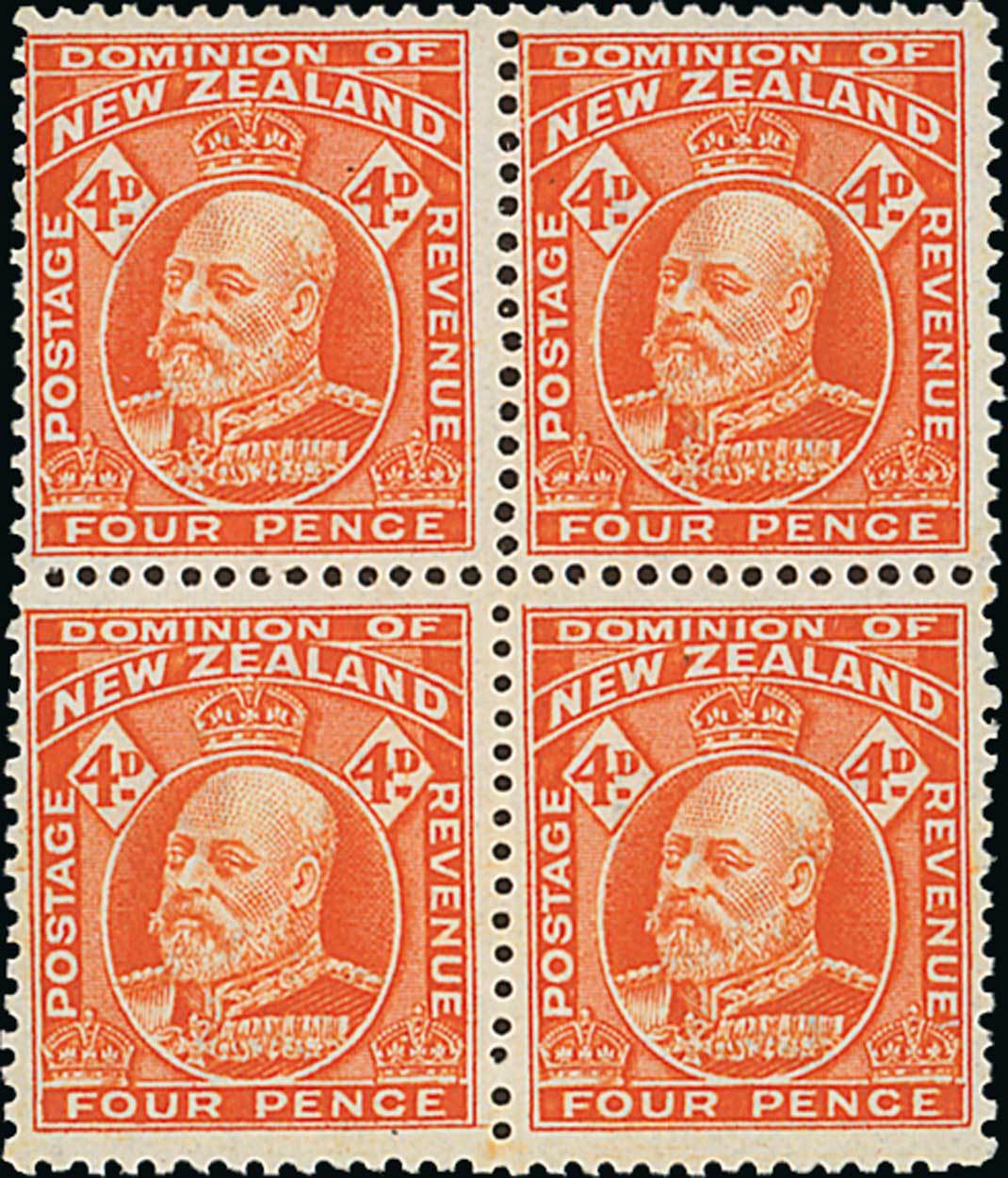1909-16 KE VII 4d. orange-red block of four with two different comb perforations, the upper pair with comb head No. 9/111, the lower pair with head 6/No.3, fresh and fine mint. Very rare. Photocopy of RPSNZ Certificate. C.P. H4c, $8,000. Photo