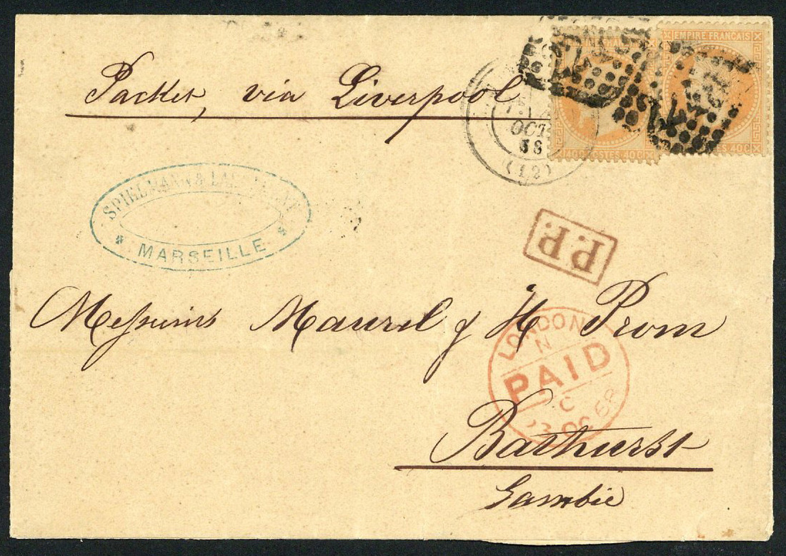 1868 (Oct.) envelope from Marseilles to Bathurst, marked "Packet via Liverpool", bearing 1863-70 40c. pale orange (2) cancelled by large number "2277", showing framed "p.p." and London Paid transit d.s. (23.10) in red with French transit datestamps on reverse