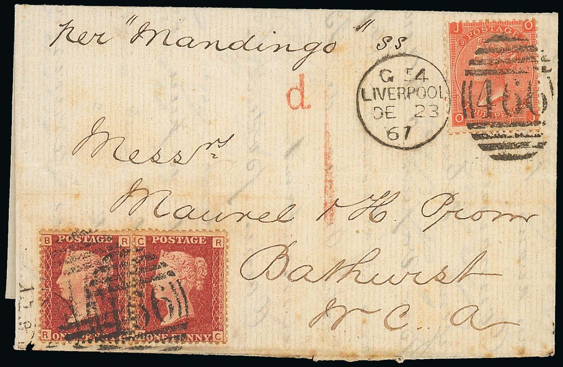 1867 (23 Dec.) entire from Liverpool to Bathurst, marked "per Mandingo S.S.", bearing 1858-79 1d. Pl. 94 pair and 1867 4d. vermilion Pl. 9, all tied by "466" duplex and showing "d1" accountancy h.s. in red; some light filing creases. Photo