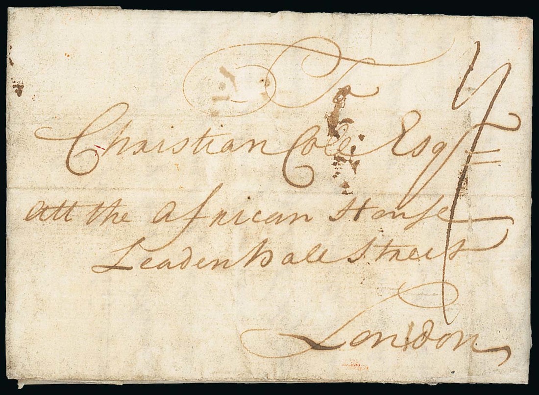 1733 (3 Oct.) entire letter to "the African House, Leadenhall Street, London", apparently written in August, with date changed to October (presumably on day of despatch), endorsed "Cape Palmas" (Liberia) inside, in a different hand, showing on reverse London Bishopmark (3.3), with indistinct manuscript charge mark, likely to be "3" or "4" for onward delivery to London. An extraordinary survival of utmost importance, being the earliest recorded cover from the Gold Coast. Photo