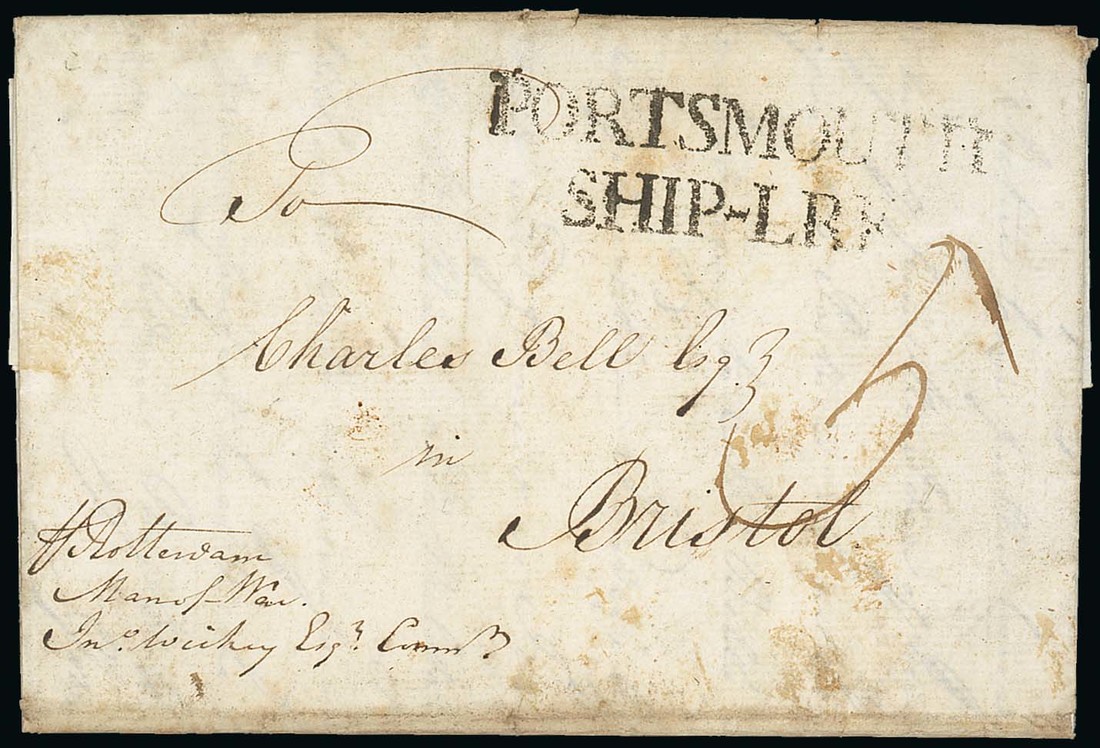 1783 (16 May) entire letter written at "Cape Coast Castle", sent to Bristol on "Rotterdam/Man of War", rated "5" on arrival, showing "portsmouth/ ship-lre" h.s. (Type S.1) on face. Fine and rare early correspondence. Photo