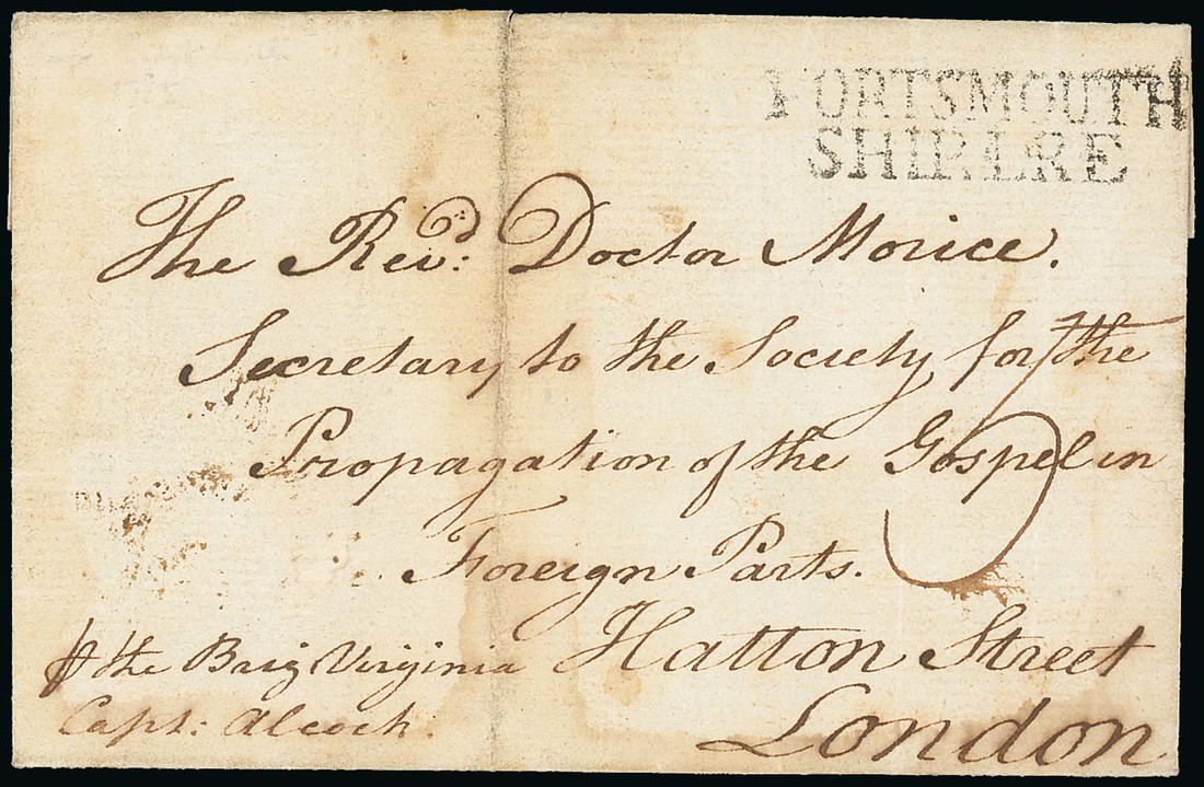 1785 (1 July) entire ex the "Quaque" correspondence sent from "Cape Coast Castle" to London on "the Brig Virginia" rated "5" on arrival, showing "portsmouth/ship-lre" (Type S.1) with London Bishopmark (10.10) on reverse. Fine and rare. Photo