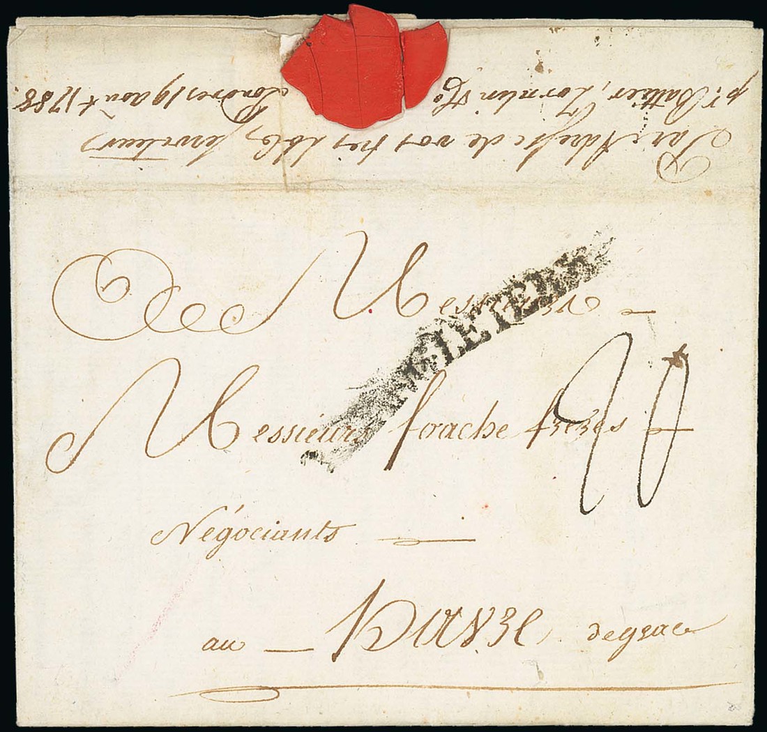 1788 (13 Mar.) entire letter, penned by French captain of a slave ship, sent from "Akra" to Le Harve, routed through London where "20" rate and manuscript transit mark of private delivery company "Battier Zornlin & Co. (19.4), "d'angleterre" h.s. applied in Paris before final delivery. Photo