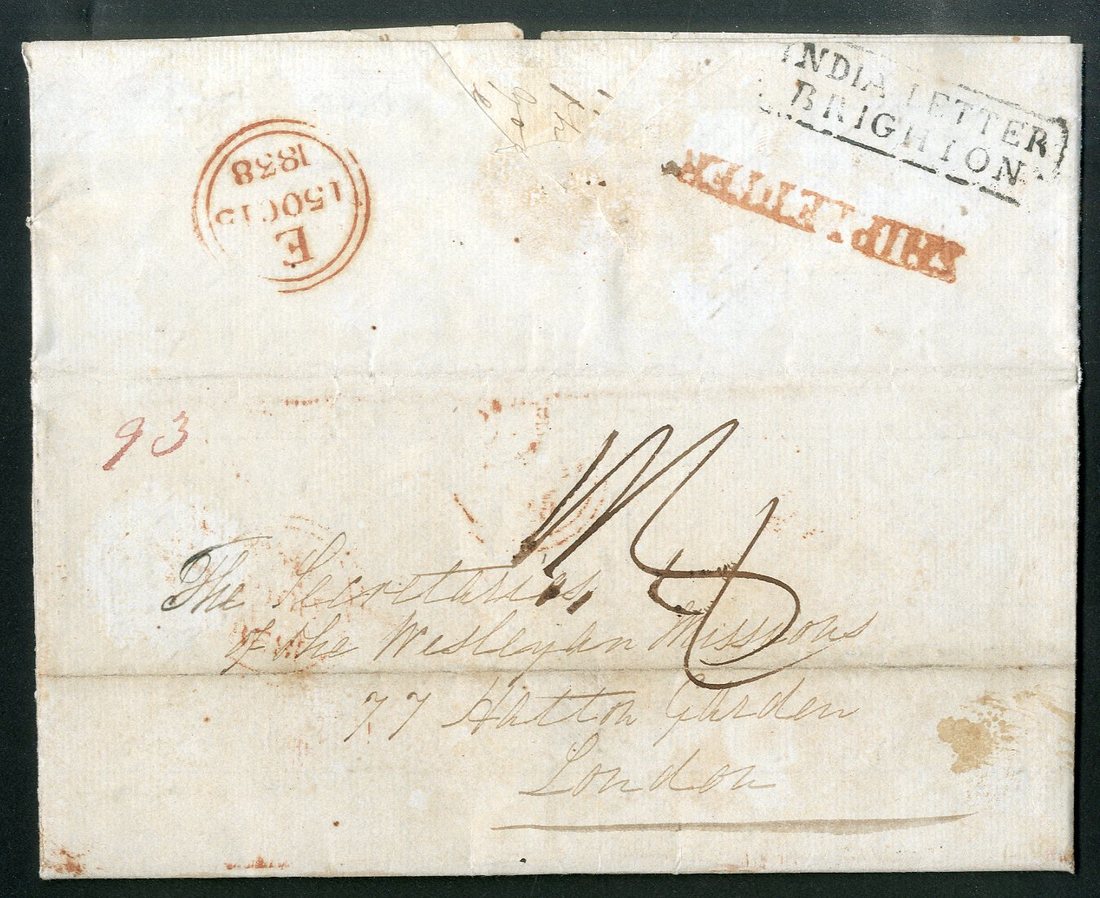 1838 (2 Aug.) entire letter from Annambone to London, showing on reverse "india letter/brighton" and "shipletter" handstamps (in black and red respectively) plus arrival (15.10) datestamp. Opens well for display. Photo