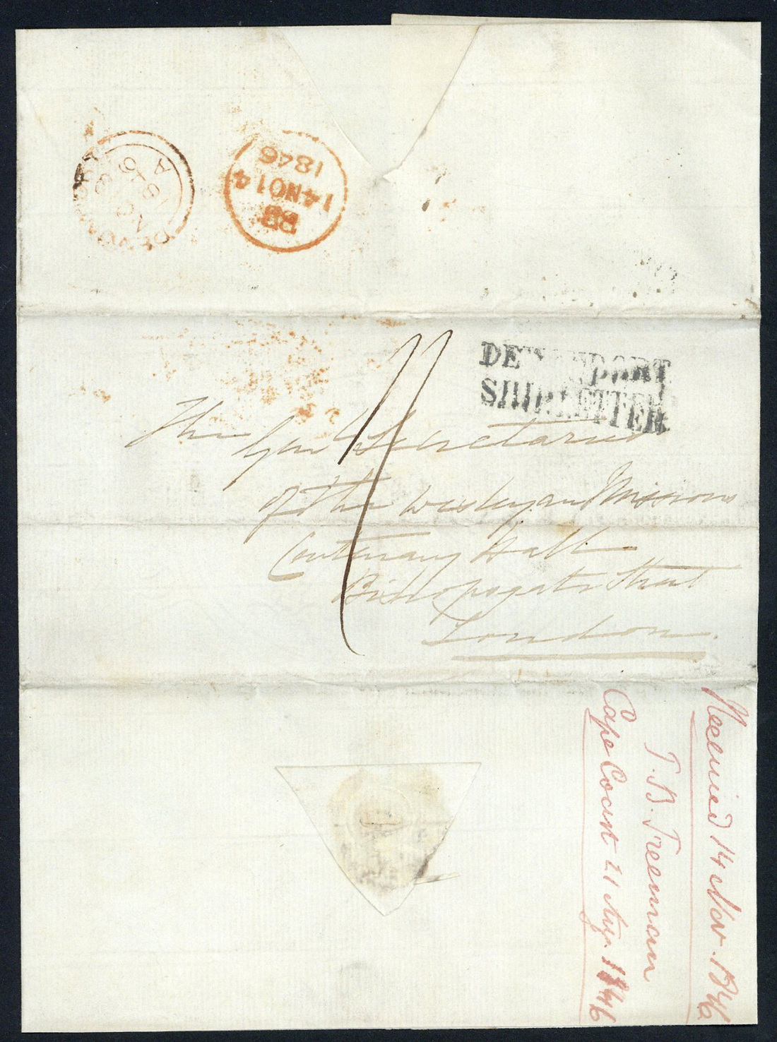 1846 (21 Aug.) entire from Cape Coast Castle to London, showing "devonport/ship letter" (Type S.7), rated "1/-" on arrival, showing Devonport (13.11) and London (14.11) transit and arrival datestamps on reverse. Fine.