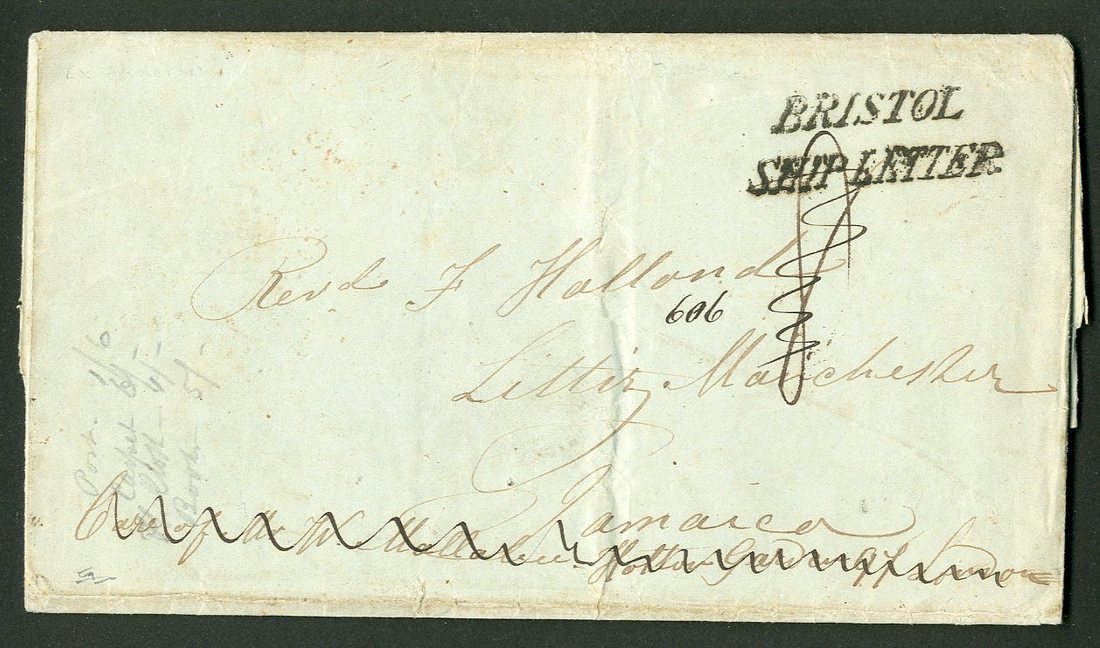 1848 (16 July) missionary entire letter from Akropong to Jamaica via London, showing "bristol/ship letter" (Type S.11) rated "8", forwarded by "W Mallabee, Hatton Garden" to Little Manchester, Jamaica, reverse showing London arrival c.d.s. (12.12); some foxing on the inside of the flap, nevertheless a remarkable entire with wonderful contents requesting the sale of a horse and for the proceeds to be sent to Africa! Photo.