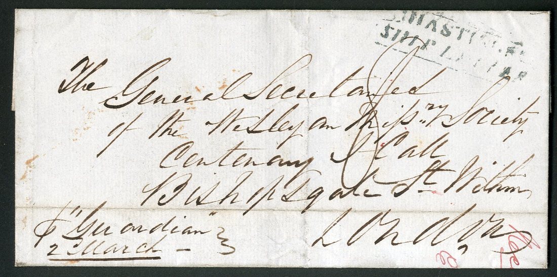 1849 (27 Feb.) entire ex the Wesleyan missionary correspondence from Cape Coast Castle to London, marked "p. Guardian", showing step-type "hastings/ship letter" (Type S.3) with red arrival c.d.s. (16.5) on reverse. Photo
