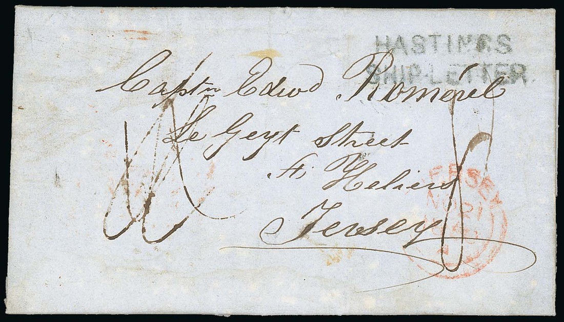 1850 (21 July.) entire from Cape Coast Castle to Jersey, showing crisply struck "hastings/ship letter" (Type S.5), rated "8" and showing red arrival c.d.s. (21.11) on face. Fine and very attractive. Photo