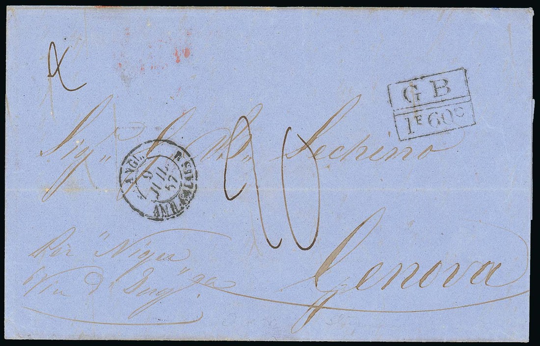 1857 (20 May) entire from Accra to Genoa via London, marked "Per Niger, Via Suez", showing framed "gb/1f 60c" (Fig. 3040) and, on reverse, "plymouth/ packet-letter" (7.7), London (9.7) and Paris (10.5) transit c.d.s. Fine and rare. Photo