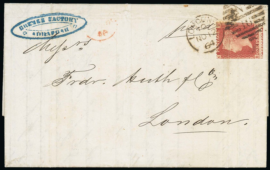1864 (7 Oct.) entire letter from Ada Foah to London, showing "bremen factory/addafoah" oval cachet in blue, carried privately to London, where 1d. red was applied for final delivery, both postmark and red arrival c.d.s. on reverse dated 12 November. Stamp with trimmed perforations, otherwise fine and very attractive. Photo.