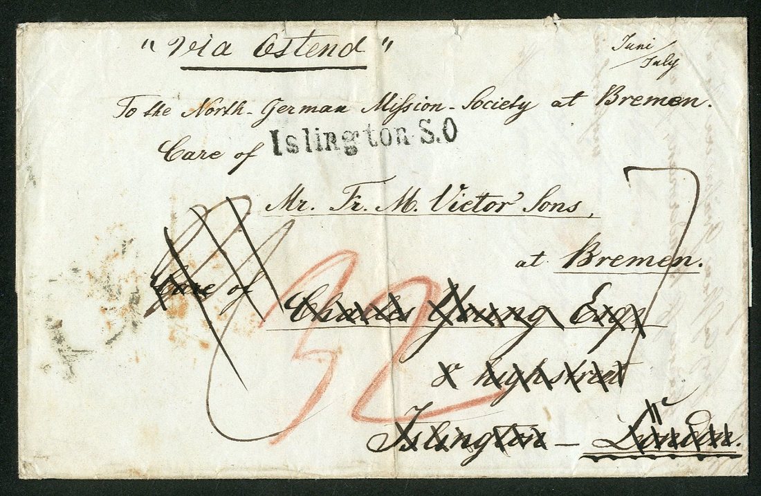 1853 entire (June/July) from Keta and Teshi to Bremen via London, showing "plymouth/ packet letter" (9.9) c.d.s. in red (Type P.2) London arrival c.d.s. (10.9) in red on flap, with various accountancy marks on face, endorsed "Care of Charles Young Esq...." with black "Islington S.O." single line handstamp, forwarded privately to Bremen "Via Ostend". Slight ageing to edges, and flap with tears, otherwise fine. Photo.