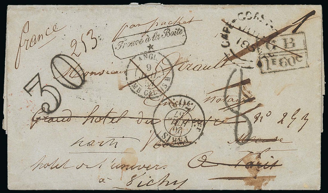 1857 (5 June) entire letter from Cape Coast Castle to Paris, redirected to Sicily, showing "cape coast castle" double-arc d.s., "gb/1f.60" (Fig. 3040), framed 'Trouve a la Boite" (Found in a box!) h.s., handstruck "30" and various (11) transit c.d.s. A charming and very unusual entire. Photo.