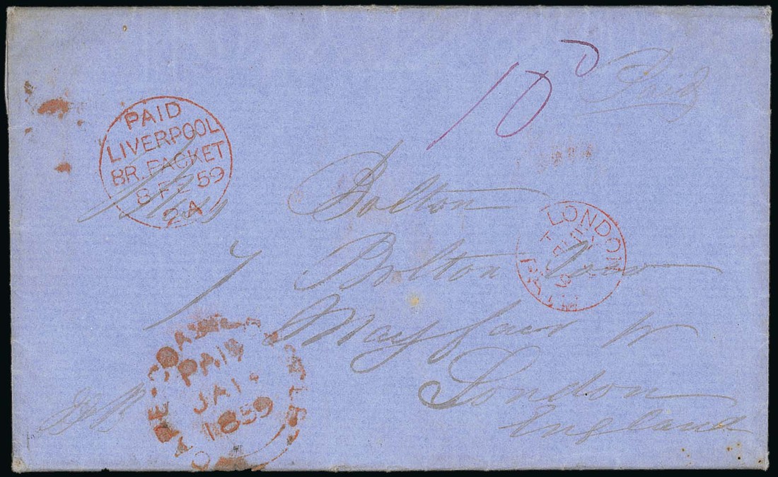1859 (11 Jan.) entire letter from Cape Coast Castle to London, showing "cape coast castle/paid" double-arc c.d.s. in red, manuscript "10d" in purple, "paid/ liverpool/ br. packet" c.d.s. (8.2) and London arrival datestamp (9.2). A particularly attractive cover perfect for display with all on face. Photo