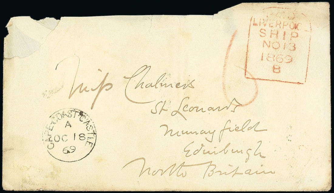 1869 (18 Oct.) envelope to Edinburgh, showing red crayon "6", "cape-coast-castle" c.d.s. and "liverpool/ship" tombstone d.s. with Edinburgh (13.11) and Murrayfield (14.11) transit and arrival c.d.s. on reverse; upper edge damaged and slightly reduced during opening, still a visually appealing cover. Photo.