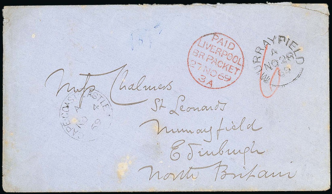 1869 (4 Nov.) envelope to Edinburgh, showing red crayon "6", "cape-coast-castle" c.d.s. and "paid/liverpool/br. packet" c.d.s. (27.11) alongside crisp unframed Murrayfield arrival c.d.s. A couple of trivial age spots, nevertheless a fine and attractive cover with crisply struck markings. Photo.