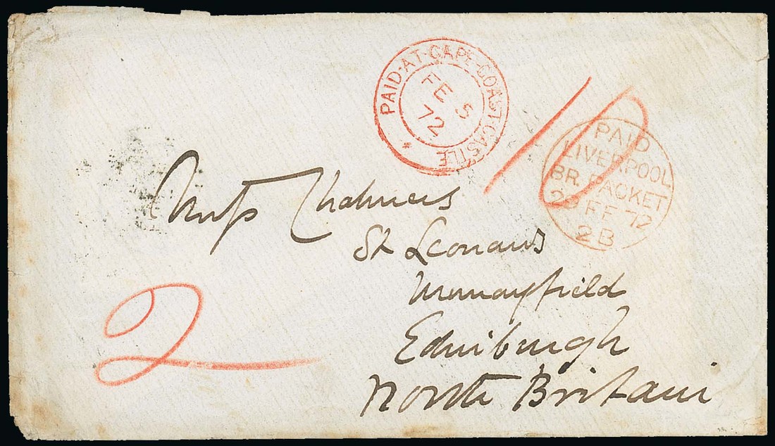 1872 (5 Feb.) envelope to Edinburgh, showing red crayon "10" and "2", a fine strike of " paid at cape-coast castle" c.d.s. and "paid/liverpool/br. packet" c.d.s.(29.2) with Edinburgh (29.2) with Murrayfield (1.3) transit and arrival c.d.s. on reverse. Photo
