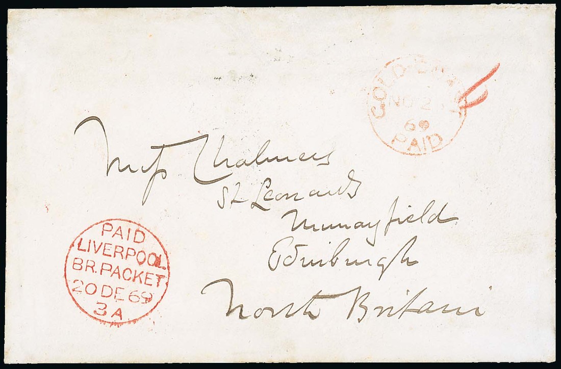 1869 (28 Nov.) envelope to Edinburgh, showing red crayon "6", the unique "gold coast/paid" c.d.s. in red (apparently hand carved) and "paid/liverpool/ br. packet" c.d.s. (20.12) with Edinburgh (20.12) and Murrayfield (21.12) transit and arrival c.d.s. on reverse. Choice quality, and the only recorded example of this postmark. Photo