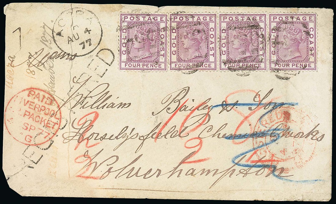 1877 (4 Aug.) envelope registered to Wolverhampton, bearing 1876 4d. magenta strip of three and a single, all cancelled by light "554" barred oval, showing red crayon "8/4" corrected to "10", "registered" handstamp, Accra c.d.s. (4.8), "paid/liverpool/br. packet" c.d.s. (4.9) with arrival c.d.s. (5.9) on reverse. Minor edge faults including rounded lower left corner, otherwise fine. Photo.