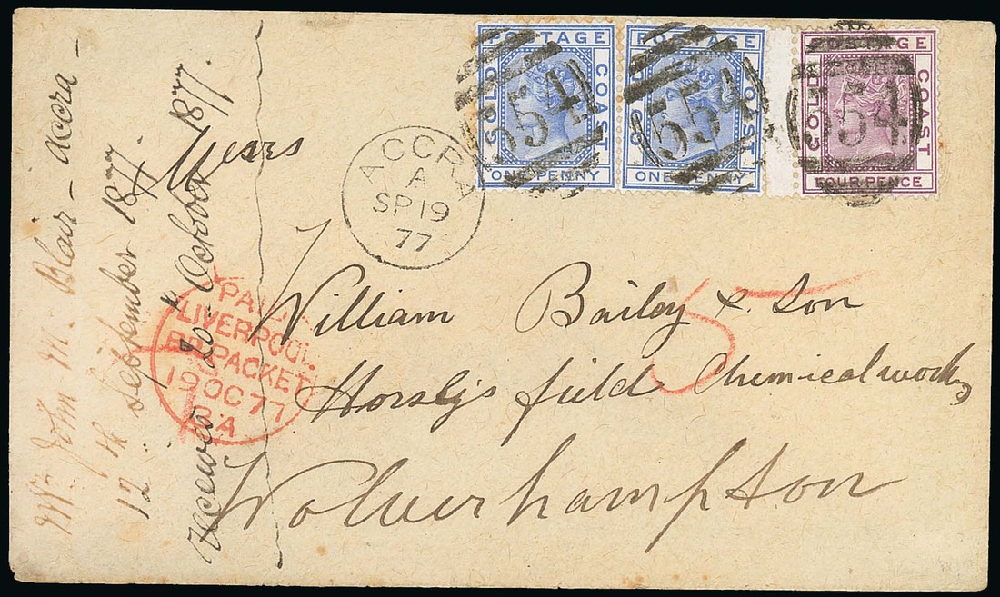 1877 (19 Sept.) envelope to Wolverhampton, bearing 1876 1d. blue (2) and 4d. magenta, all crisply cancelled by "554" in oval of bars, showing red crayon "5", "accra" c.d.s., "paid/liverpool/br. packet" c.d.s. in red (19.10) with arrival c.d.s. (20.10) on reverse. Photo