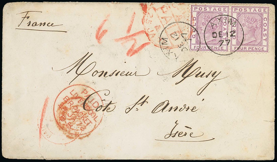1877 (12 Dec.) envelope to France, bearing 1876 4d. magenta pair neatly tied by "axim" c.d.s., showing red crayon "1" and "6½", faint strike of "paid at cape coast castle c.d.s. with indistinct date, "paid/liverpool/br. packet" c.d.s. (24.1) with London, (25.1) and French (2) arrival marks (27.2) on reverse. A rare and early date of usage from Axim. Photo