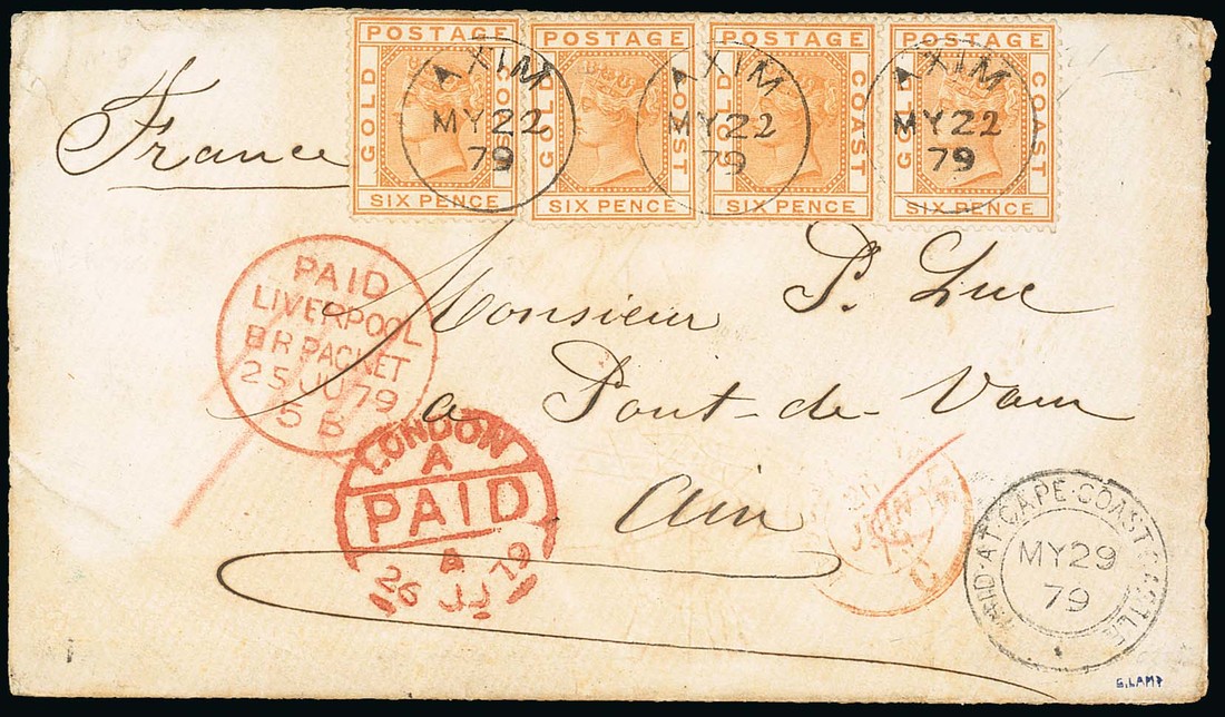 1879 (22 May) envelope to France, bearing 1876-84 6d. orange (4) cancelled with three "axim" (22.5) c.d.s. with day in manuscript, showing red crayon "6" and "1/6", fine "paid-at-cape-coast-castle" c.d.s. (29.5), "paid/liverpool/br. packet" (25.6), and London Paid (26.6) transit c.d.s. with arrival datestamp. A rare, clean and attractive cover in unusually fine condition. Photo