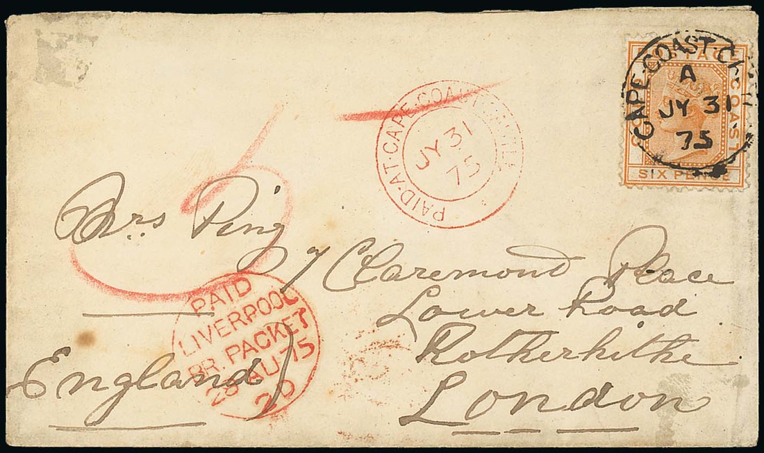 1875 (31 July) envelope to London, bearing 1875 6d. orange cancelled with neat "cape-cost-castle" c.d.s., showing red crayon "5", "paid-at-cape-coast-castle" c.d.s. (31.7) and "paid/liverpool/br. packet" (28.8) d.s. with London arrival on reverse. A fine and extremely rare first issue usage. Photo.