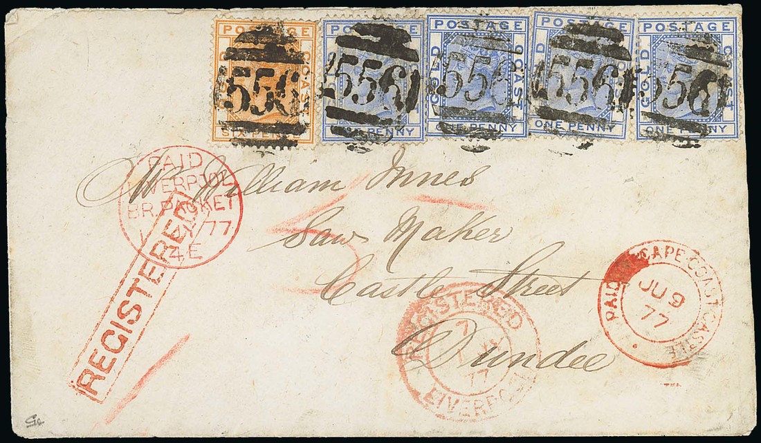 1877 (9 June) envelope registered to Dundee, bearing 1876 1d. blue (4) and 6d. orange, each cancelled with "556" in oval of bars, showing red crayon "1" and "5", crisply struck "paid-at-cape-coast-castle" c.d.s., "paid/liverpool/br. packet" and "registered/liverpool" d.s. (both 1.7), neat boxed "registered" handstamp and, on reverse, Dundee arrival d.s. (2.7). Very fine with lovely clear strikes. Photo.
