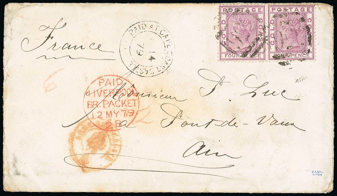 1879 (June) envelope to France, bearing 1876 4d. magenta pair tied by legible "556" in oval of bars, showing red crayon "2" and "6", "paid-at-cape-cast-castle" c.d.s. in black (rare thus), "paid/liverpool/br. packet" (12.5) and Calais datestamps with arrival c.d.s. on reverse. Fine and rare. Photo