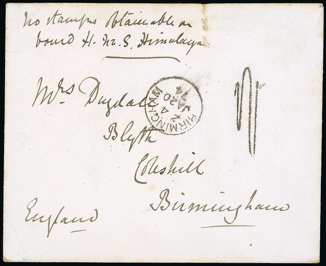 1874 envelope to Birmingham, rated "1/-" in black, marked "No stamps obtainable on board H.M.S. Himalaya", showing "liverpool/br. packet" (19.1) and Birmingham (20.1) transit and arrival c.d.s. Trivial mark paper clip on top edge, otherwise clean and fine. Photo