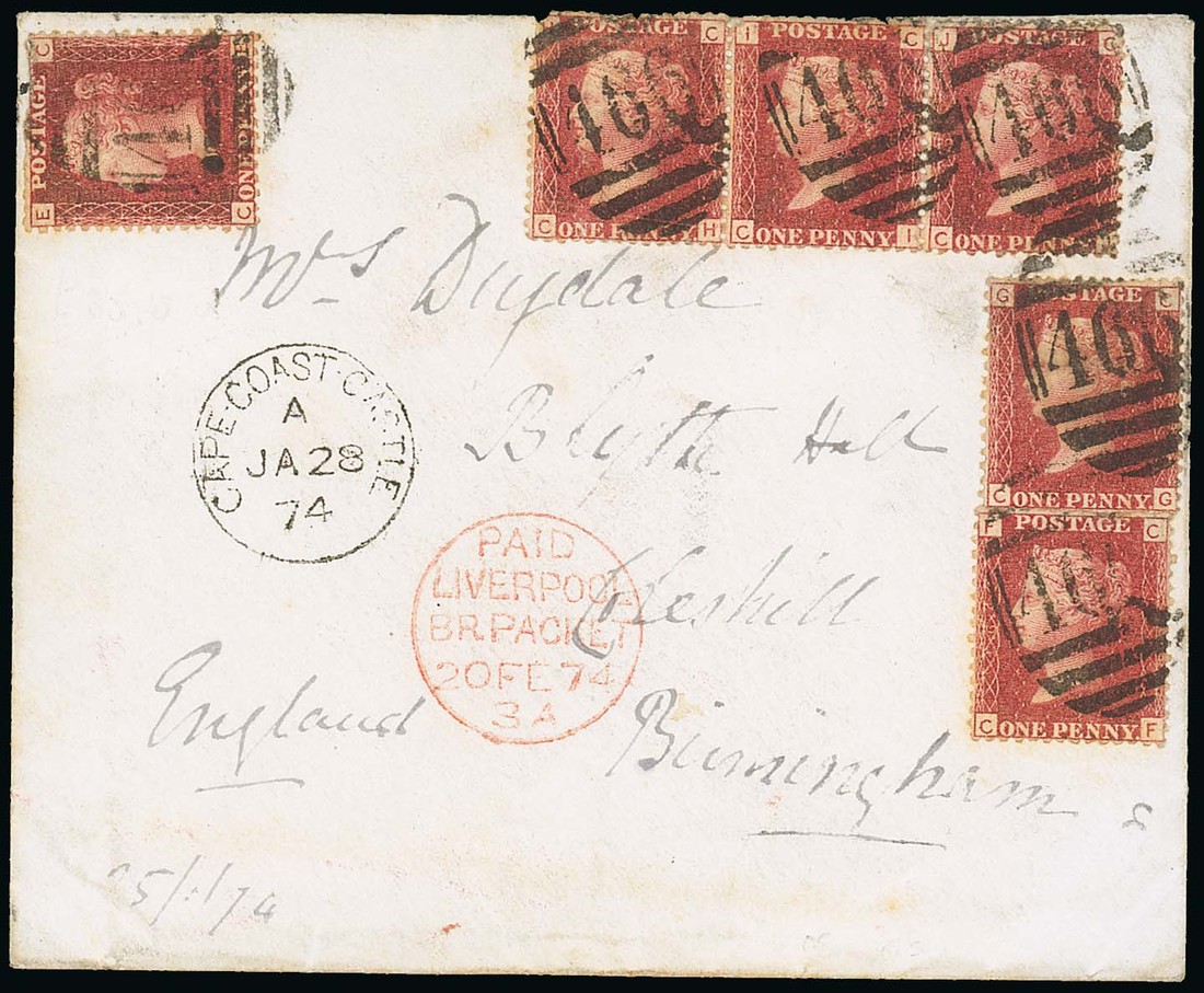 1874 (25 Jan.) Officer's envelope to Birmingham, showing "cape-coast-castle" c.d.s. (28.1), bearing GB 1858-79 1d. red (6) to pay 6d. officer's rate, each cancelled with "466" (Liverpool) barred oval, showing "paid/ liverpool/ br. packet" c.d.s. (20.2) with London arrival c.d.s. (20.2) on reverse. Torn flap, otherwise very fine. Photo