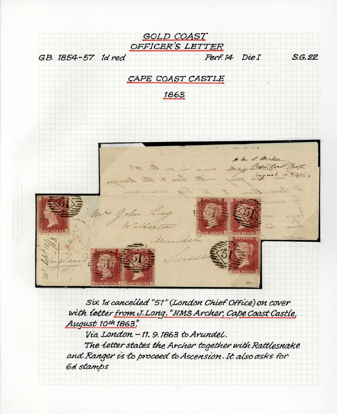 1863 (10 Aug.) Officer's letter from J. Long aboard H.M.S. Archer to his mother in Arundel, Sussex, bearing GB 1854-57 1d. red (6) paying officer's rate, each cancelled with neat "51" (London) diamond in barred oval, showing on reverse London and Arundel (both 11.9) transit and arrival marks. The letter begins "My dearest Mamma, This is a very miserable hole..before reporting that the Archer and Rattlesnake will soon be proceeding to Ascension; accompanied with a hand drawn map and sketch of Cape Coast Castle. Flap missing, though fascinating early correspondence. Also 1869 (9.12) letter from "Jellah Coffee" from sailor aboard "H.M.S. Growler" with similar content.