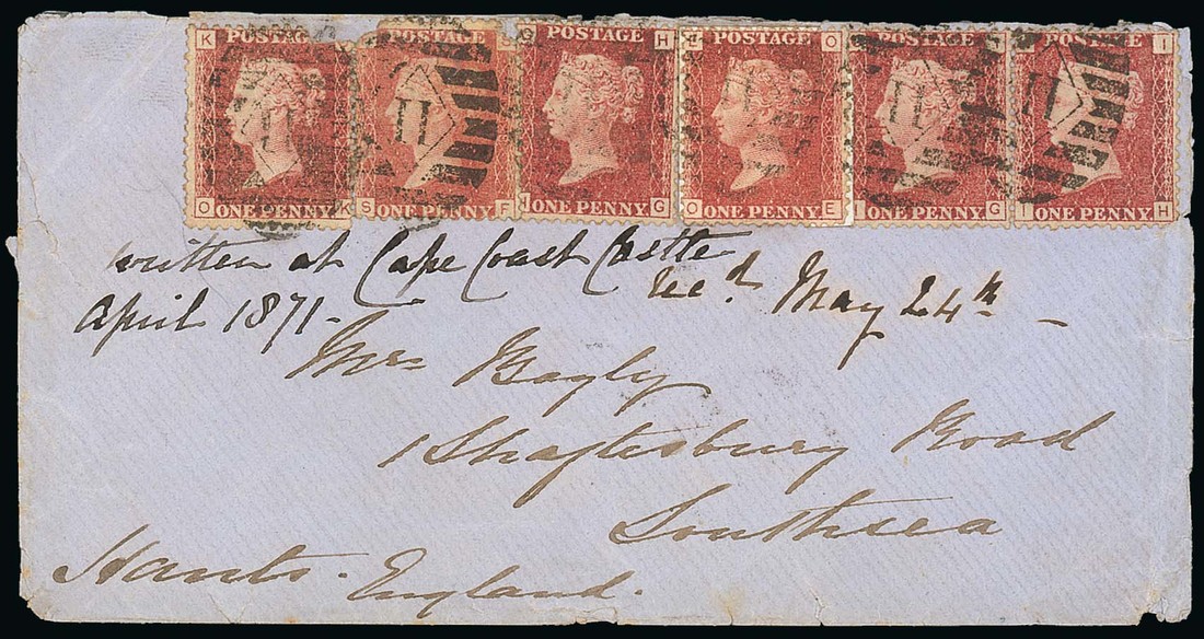 1871 (April) Officer's envelope to Southsea with printed "H.M.S. Rattlesnake" crest on flap, bearing GB 1866-69 1d. red (6) one of which has been removed from another cover and reused (on piece!), each cancelled with "11" in barred oval (G.P.O) cancellation and showing Portsmouth arrival c.d.s. (24.5) on reverse, recipient's notation "written at Cape Coast Castle April 1871, recd May 24th" below adhesives; edges and corners worn, still an unusual and attractive cover. Photo