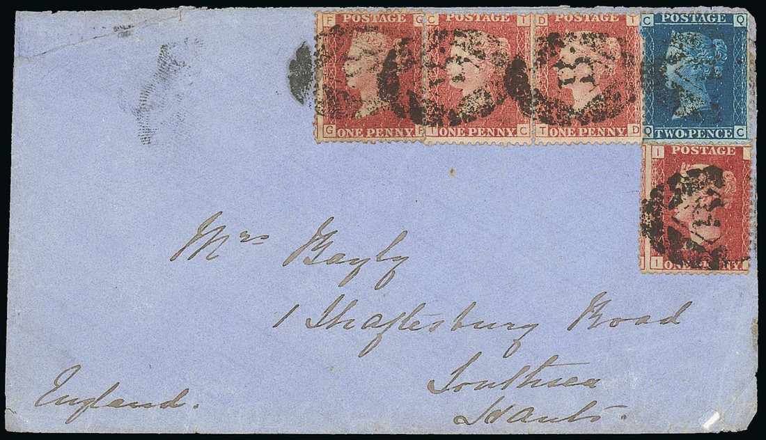 1873 Officer's envelope to Southsea, bearing GB 1866-69 1d. red (4) and 2d. blue (1) paying officer's rate, each cancelled with "B" in barred oval (Foreign Branch), showing Portsmouth arrival c.d.s. (6.8) on reverse. Flap missing, and worn edges, still an unusual and attractive cover. Photo
