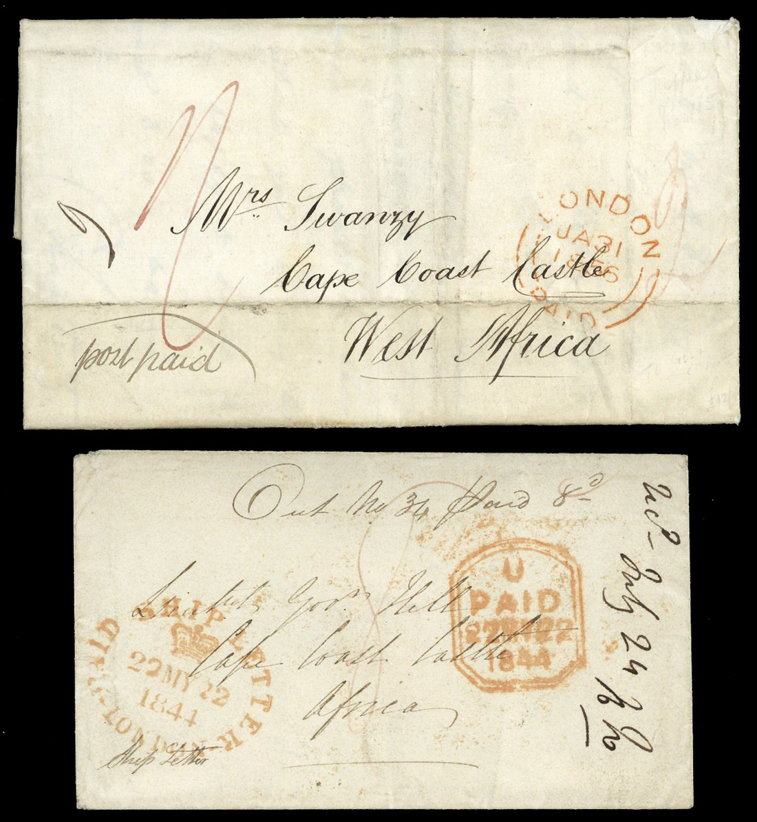 1844 (22 May) envelope from London to Cape Coast Castle, showing Paid d.s. and "paid ship letter/london" oval d.s., both in red, and 1856 (31 Jan.) entire letter from London to Cape Coast Castle, rated "2" and "1/-" in red (proving that the Cape Coast Office was open at this stage) and showing "london/ paid" c.d.s. and no other postal markings. An interesting pair of covers