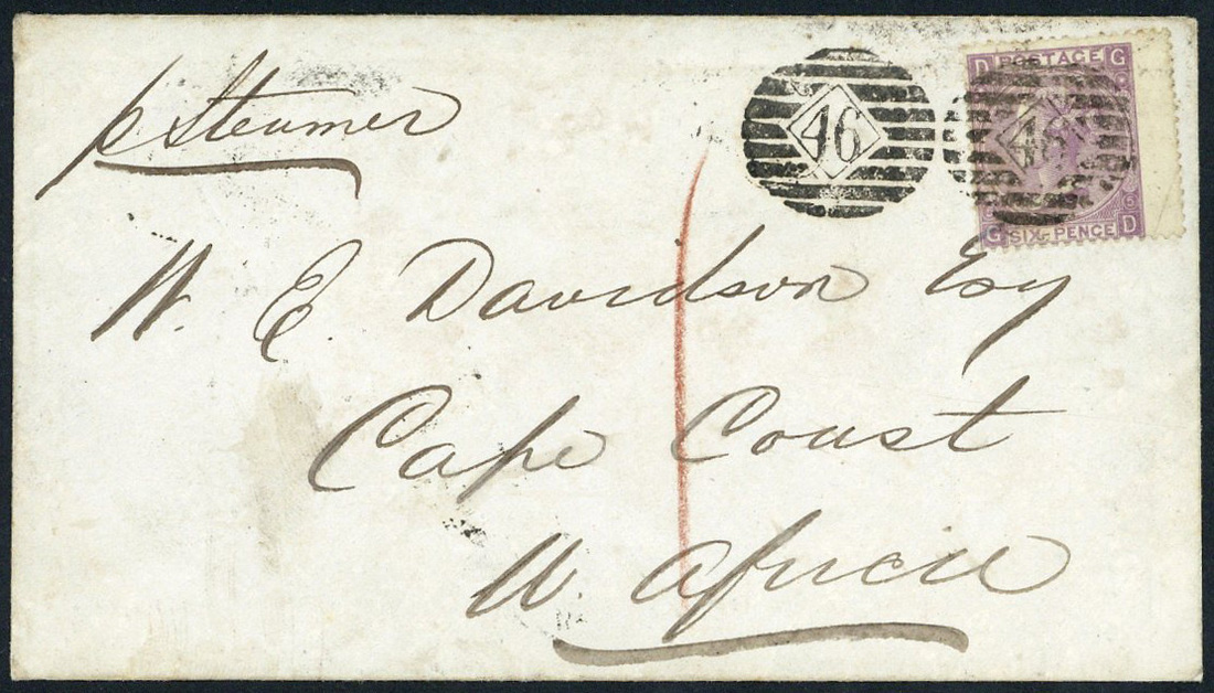 1865 (23 Aug.) envelope addressed to "Cape Coast, West Africa", showing red crayon "1", bearing GB 1865-67 6d. lilac Pl.5 (with hyphen) tied by "46" obliterator; the envelope with "ewell gunpowder office" logo on flap. Mark from adhesive on reverse, still fine facial appearance.